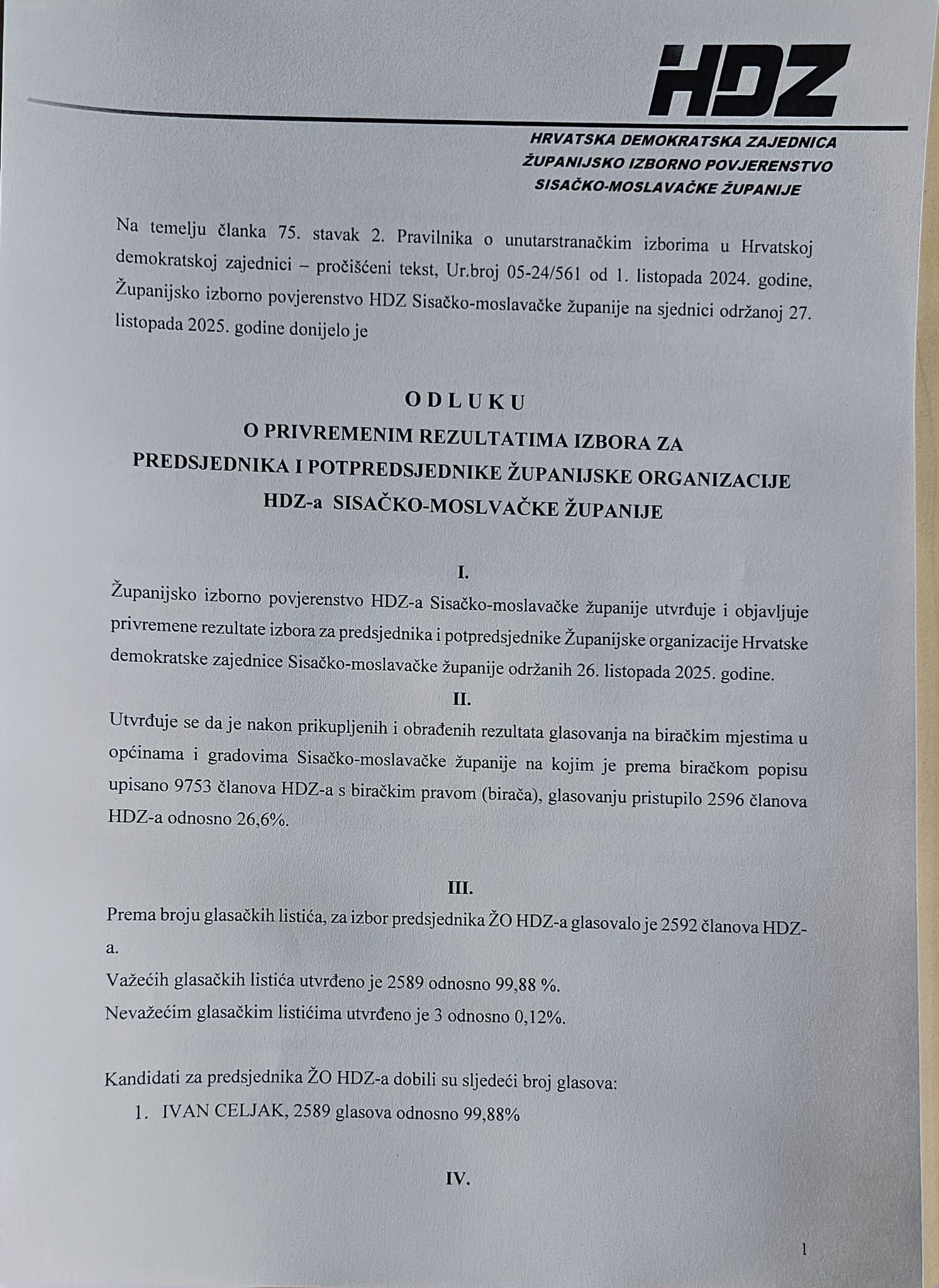 Odluka o privremenim rezultatima izbora za predsjednika i potpredsjednike Gradske organizacije HDZ-a Grada Siska.