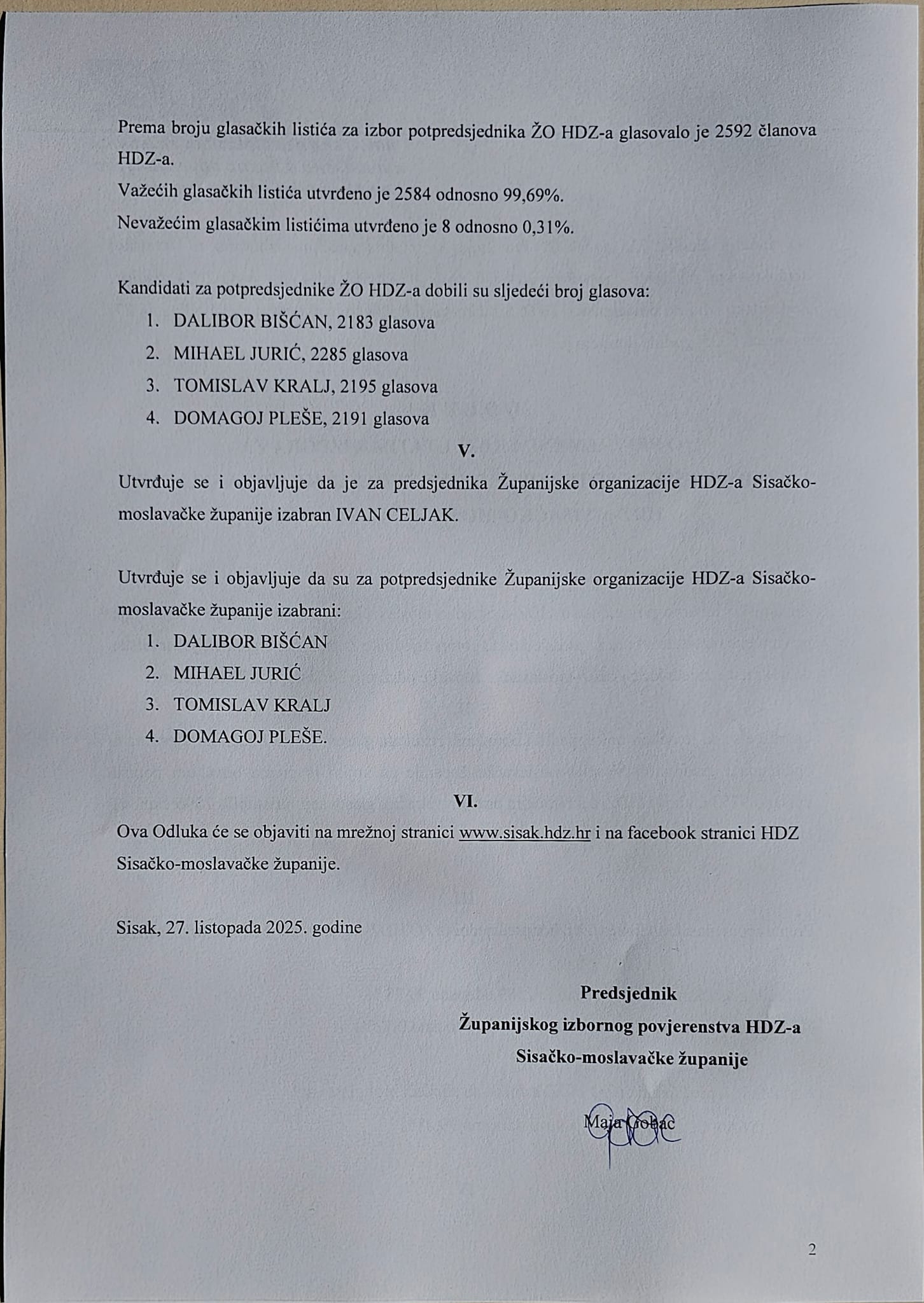 Odluka o konačnim i službenim rezultatima izbora za predsjednika i potpredsjednike Županijske organizacije HDZ-a Sisačko-moslavačke županije.